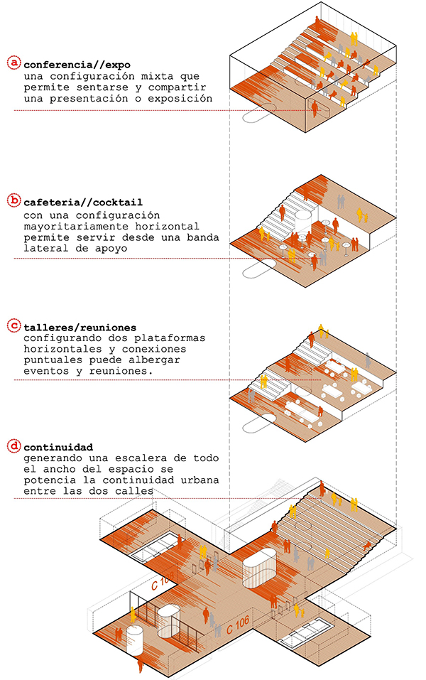 integra el desnivel entre las dos calles. Se consigue así conectarlas aportando un doble valor al resultado, que no dispone de una fachada trasera sino dos principales con