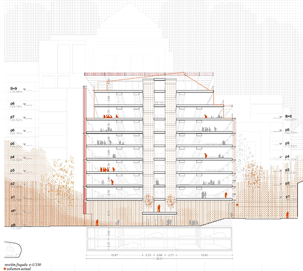 Nuestra propuesta construye una nueva envolvente coherente con estas condiciones, como si de un telón se tratase, del mismo modo que Alberti hizo en Santa Maria Novella en 1470